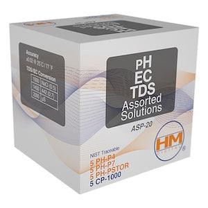 HM Digital 20 pack mix of 1000 ppm TDS, pH 4, pH7, pH storage solutions