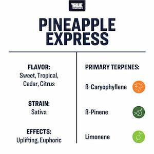 Pineapple Express is a sativa strain crossing Trainwreck and Hawaiian. It is potent, flavorful, and long-lasting. The sweet, tropical, cedar flavored strain has uplifting, euphoric, energy-boosting effects.